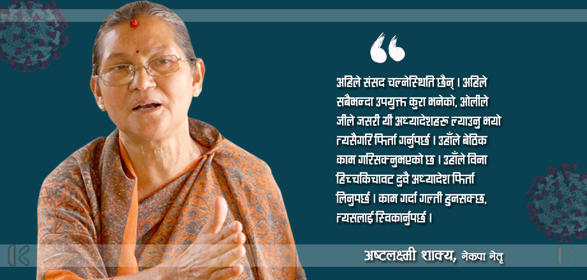 सरकारको पछिल्लो कदमसँगै सिर्जना भएको अन्यौंलताका बीच खबर डबलीका सन्देश अर्यालले नेकपाकी नेतृ अष्टलक्ष्मी शाक्यसँग केहि जिज्ञासा राखेका छन् । मुख्यतः अध्यादेश पारीत गराएसँगै नेकपाभित्र देखिएको अन्यौलता बारे शाक्यसँग कुराकानी गरिएको छ । नेकपाकी प्रभावशाली नेतृ तथा स्थायी समिति सदस्य अष्टलक्ष्मी शाक्यसँग गरिएको कुराकानीको सम्पादित अशं ।