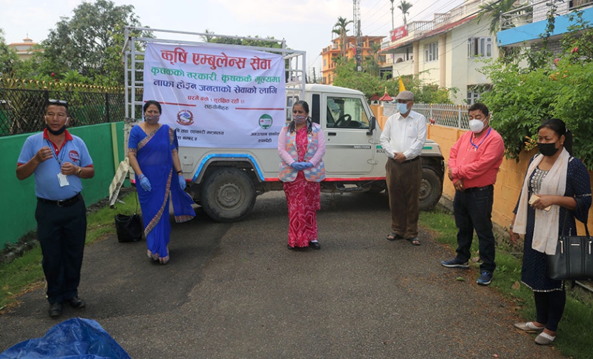 कोभिड—१९ को नियन्त्रणका लागि यहाँ बाहिरबाट आउने तरकारी तथा फलफूुललाई पूर्णरुपमा प्रतिबन्ध लगाइएका अवस्थामा स्थानीयस्तरमा उत्पादित कृषि उपजको सुलभ आपूर्ति तथा वितरणको व्यवस्थापनका लागि कृषि एम्बुलेन्स सञ्चालन गरिएको ऋग्वेद कृषि फार्मका सञ्चालक सन्तोष पन्थले बताए ।