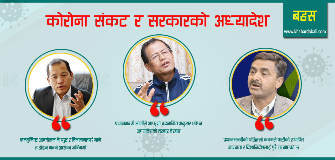 \"\" काठमाडौं । कोरोना महामारीले निम्त्याएको संकटका बीच सरकारले एकाएक दुईवटा अध्यादेश मन्त्रिपरिषदबाट पारित गराउँदै राष्ट्रपतिबाट पनि अनुमोदन गराएको छ । राजनीतिक दलसम्बन्धी अध्यादेश र संवैधानिक परिषदसँग सम्बन्धित अध्यादेशलाई सरकारले पारित गराएको हो । सरकारले एकाएक अध्यादेश ल्याएर पारित गराएसँगै अहिले राजनीतिक वृत्तमा निकै ठूलो अन्यौंलता सिर्जना भएको छ । जसबाट सत्तारुढ पार्टीमात्रै नभई अन्य राजनीतिक दलहरु पनि अन्यौलमा छ । सरकारको पछिल्लो कदमसँगै सत्तारुढ पार्टीभित्र विभाजन र फुट त आउने होइन् भन्ने त्रासदी पनि देखिएको छ । आमनागरिक लकडाउनमा रहिरहेको बेलामा सरकारले चालेको यस कदमले नैराश्यताको स्थिति पनि विकास गराएको छ । कोरोना संकटका बीच एकाएक अध्यादेश ल्याइनुमा सरकारको नियतबारे पनि प्रश्न उठेका छन् । खबर डबलीले सरकारले ल्याएको अध्यादेशबारे सत्तारुढ दलकै नेता र प्रतिपक्षका नेतासँग प्रतिक्रिया लिएको छ । सत्तारुढ दल नेकपाका नेताद्वय गणेशमान पुन अनि ठाकुर गैह्रे र प्रमुख प्रतिपक्षी दल नेपाली कांग्रेसका नेता धनराज गुरुङ्गसँग सरकारले ल्याएको अध्यादेशबारे प्रतिक्रिया लिएको छ । नेता पुन, गैह्रै र गुरुङ्गसँग लिएको प्रतिक्रिया जस्ताको तस्तै ।