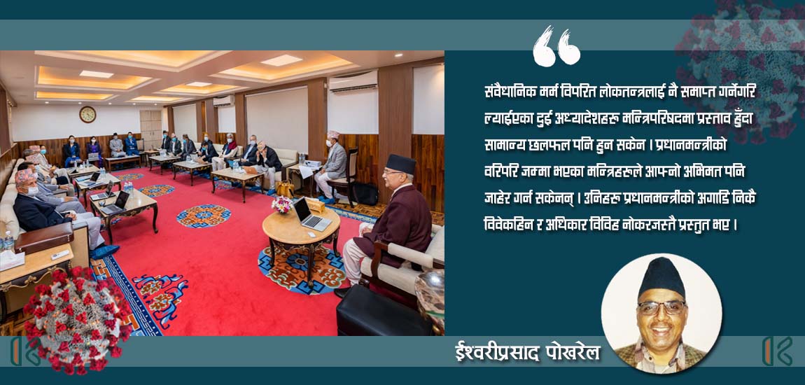 सन्दर्भ, हालै मन्त्रिपरिषदबाट पारित भई राष्ट्रपतिबाट लालमोहर लगाईको दल विभाजनसम्बन्धित र संवैधानिक परिषदसँग सम्बन्धित दुई अध्यादेश पारित प्रक्रियाबारे हो । सरकारको नाममा संवैधानिक मर्म विपरित गणतन्त्र र लोकतन्त्रलाई नै समाप्त हुने गरि ल्याईएका दुई अध्यादेशहरु मन्त्री परिषदमा प्रस्ताव हुँदा पनि सामान्य छलफल पनि हुन सकेन ।