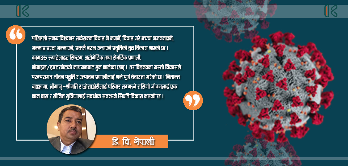 म जोड्न चाहान्छु कि कोरोना रोग (कोभिड-१९)को कारण मानिसले हजारौं वर्षबाट विकास गरेको सामाजिक/सांस्कृतिक मुल्यमान्यता, जीवनपद्धति, आर्थिक तथा उत्पादन प्रणाली, खानपानलगायतका दैनिनदिनको गतिविधिहरुलाई त मानव जीवनको रक्षार्थ विश्वव्यापी रुपमा प्राय: सम्पूर्ण बन्द (टोटल लकडाउन) गर्न हामी बाध्य भयौं । हामीलाई लागिरहेको छ, कोरोना रोग नियन्त्रण हुन्छ, निर्मूल हुन्छ त्यो नभएपनि लकडाउन खुल्छ र हामी पुरानै जीवनमा फर्कन्छौं । बाँकी रहेका कामलाई पुरा गर्छौं, नमिलेका हिसाब किताब मिलाउॅंछौं ....यस्तै उस्तै त हो नि सक्कि गयो । हो, यहिँनेर छ बुझ्नुपर्ने चुरो कुरो र सोँच्नु पर्ने विषय छ ।