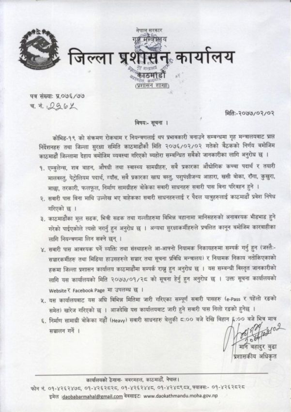 जिल्ला प्रशासन कार्यालय, काठमाडौंले एक सूचना जारी गरी गल्लीहरूमा जम्मा नहुन आग्रह गरेको र जम्मा भएको वा हिँडडुल गरेको पाइएमा प्रहरीले नियन्त्रणमा लिन सक्ने जनाइएको छ ।