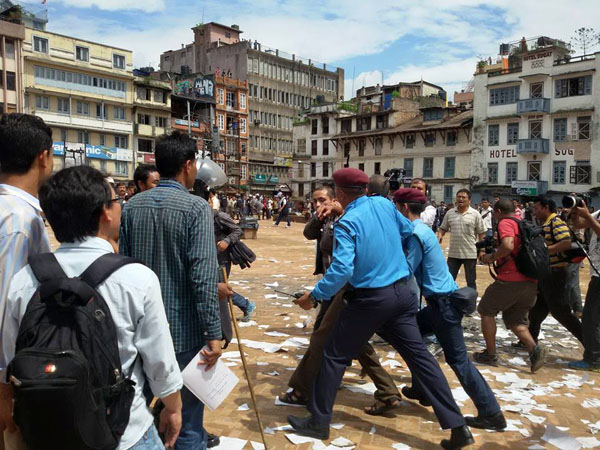 \"basantapurसाउन ५, काठमाडौ । संविधानको मस्यौदा माथी सुझाव संकलनको लागी बसन्तपुरमा आयोजना गरिएको कार्यक्रममा माओवादी र राप्रपा नेपालका कार्यक्रताले अवरोध पु¥याए पछि झडप भएको छ । सुझाव संकलका लागि आयोजना गरिएको कार्यक्रमको स्टेजमा माओवादी र राप्रपाका कार्यक्रताहरु नाराबाजि सहित प्रवेश गरेपछि झडप भएको थियो । झडप पछि नाराबाजी सहित कार्यक्रम बिथोल्न गएका दुईजना लाई प्रहरीले नियन्त्रणमा लिएको छ । सभासद नविन्द्रराज जोशी र राज्यलक्ष्मी श्रेष्ठको उपस्थितिमा सुझाव संकलन कार्य भइरहेको थियो । उनिहरु दुवै जनालाई प्रहरीले कडा सुरक्षामा राखेको छ । झडपका कारण केहिबेर तनावपुर्ण बनेको कार्यक्रम अहिले कडा सुरक्षा व्यवस्थाका पुनः सुचारु भइरहेको छ । यस अघि पनि राजधानीका विभिन्न स्थानहरूमा सुझाव संकलन कार्यक्रममा झडप भएकाे थियाे ।