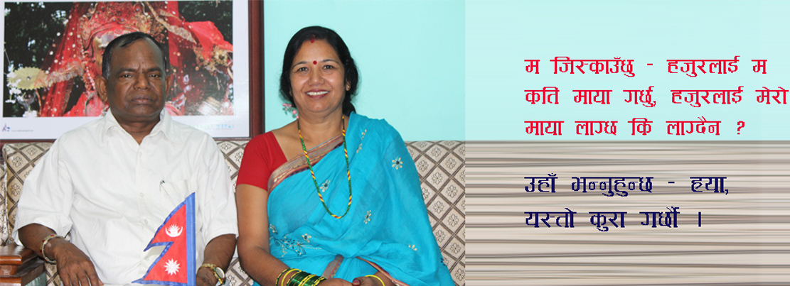 उहाँ (लालबाबु पण्डित) को सर्लाही स्थायी घर । म महतकी छोरी बिमला महत  राजधानीकै स्थायी बासिन्दा । हाम्रो अन्तरजातीय विवाह भयो ।  हामीबीच प्रेम सम्बन्ध भएर विवाह भएको होइन । तर अहिले संसारकै उत्कृष्ट प्रेम सम्बन्ध छ । राजनीतिकै क्रममा पार्टी संगठनमार्फत हाम्रो विवाह भयो । एक अर्कालाई धेरै माया गर्छाैं । विगत त्यति सुखमय थिएन । \"IMG_9487\"भन्न त मलाई २४ घण्टा हाँस्छे भन्छन् । तर मेरा विगतका धेरै दुःखहरु छन्, जसले मलाई पटकपटक रुवाउँछ  ।  आमाको पेटमा हुँदा नै बुवा (तीर्थबहादुर महत ) बित्नुभयो । बुवाको मात्रै होइन हामीले आमाको पनि माया पाउन सकेनौं । मेरो दाइ र म थियौं । आमालाई  हामीले निकै माया गथ्र्यौं । तर त्यसको बदलामा आमाको माया कहिले पाएनौं । त्यतिबेला बुढापाकाहरुले हामीलाई विषको बोटको अमृत भन्थे । दाई ‘गोविन्द’ जस्तो हुनुहुन्थ्यो । घर परिवारको टेन्सनले नै उहाँ बित्नुभयो ।  अंग्रेजी, हिन्दी सबै गाउनुहुन्थ्यो । हुन त मलाई गाउँका दाजुभाइले मेरो दुख देखेर जीवन कहानी लेखेर मर्नु भन्थे । रवि नपुगेको ठाउँमा पुग्छ रे कवि । कवि पनि नपुगेको ठाउँमा पुग्छ रे अनूभवी । भन्ने कतै सुनेको थिएँ  । मेरा विगत धरै दुःखहरुले भरिएका थिए । काकाहरुसँग मुद्दा मामला थियो । आमाले सबै जायजेथा काकालाई सुम्पिएकी थिइन् । हामीसँग केही थिएन । निकै दुःख गरेर एसएलसीसम्म पढें । त्योभन्दा माथि पढ्न सकिनँ । घरको काम र राजनीति दुवै अगाडी बढाउँदै गर्दा ३५ वर्ष कटेको थाहै भएन । मेरो बुवाको मामा घरपटिकी काकी सानुमायाँ कार्की र काका केशव कार्कीले मेरो निकै ख्याल गर्नुहुन्थ्यो । उहाँहरुले नै मेरा विवाहामा ठूलो भूमिका निभाउनुभयो । त्यो बीचमा मलाई माग्न धेरै आउँथे तर मैले विहे गरिनँ । धेरै राम्रा आर्थिक हैसियत भएका केटाहरु आए । कसैले तिमीलाई पाएँ भने दोहोरी लगाएर विहे गर्छु भन्नेगर्थे । एउटा सुखी अर्को दुखी भयो भने कुरा मिल्छ भन्ने कुरा म गरिरहन्थें । मान्छेहरुको घमण्ड मलाई मनपर्थेन । लालबाबुसँगको भेट ०५४ सालको निर्वाचनमा मैले भैंसीपाटी सैंवु ४ मा वडा अध्यक्ष जितें । सुशिला नेपाल सभासद् हुनुहुन्थ्यो ।  त्यतिखेर उहाँले मेरो बिहेको बारेमा लालबाबुसँग कुरा गर्नुभएछ । लालबाबुले गर्दिनँ भन्नुभएछ । त्यतिबेला बिहे नगरि  बस्छु भन्नुभएको थियो रे । यो ५७ साल तिरको कुरा हो ।  एक दिन दुई चारजना सभासद् घुम्नको लागि भैंसेपाटी जानुभएको रहेछ । म पानी थाप्न गएकी थिएँ । उहाँको पनि नाम त्यति सुनिएको थिएन । एक जना गाउँको भाउजुको पसल थियो । ‘हाम्रो बहिनी पनि वडा अध्यक्ष हो नी’  भन्दै उहाँले चिनाउनुभयो । \"IMG_9462\"सभासद्हरुको  मनमा लागेछ । सुशीला नेपालले बिहे गर भनेको केटी त यही पो रहेछ ।  अब सुशीलालाई गएर जसरी पनि सम्