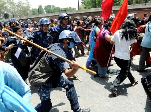 \"nepal-police-attack-women-protestors\"८ असार, काठमाडौं । विप्लव नेतृत्वको नेकपा माओवादीले गरेको बन्दको क्रममा काठमाडौंको गोंगबुबाट दर्जन बढी बन्दकर्ता पक्राउ परेका छन् । केन्द्रीय सदस्य योगेन्द्र कुमाल, उपत्यका युवा संयोजक रंत्तिमलगायतका दर्जनौं कार्यकर्ता पक्राउ परेको हुन् । माइला लामाको नेतृत्वमा सामना सांस्कृतिक परिवारले शान्तिपूर्ण ढङ्गले आयोजना गरिरहेको सांस्कृतिक कार्यक्रममा प्रहरीले दमन गरि दर्जनौं कलाकारमाथि अन्धधुन्ध लाठीचार्ज गरेको बताइएको छ । प्रहरीको लाठीचार्जमा परि आधा दर्जन महिला कलाकार घाइते भएका छन् ।
