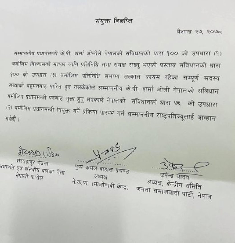उनीहरुले संविधानको धारा ७६(२) अनुसार बहुमतको सरकार गठनको प्रक्रिया सुरु गर्न राष्ट्रपतिलाई आग्रह गरेका हुन् ।