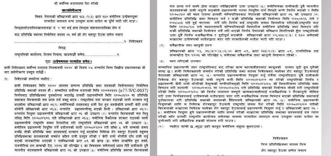 अहिले सार्वजनिक भएको रिटको सारसंक्षेपमा जेठ ८ गते भएका निर्णय तथा कारबाहीहरु असंवैधानिक र गैरकानुनी घोषणा गर्न पनि माग गरिएको छ ।