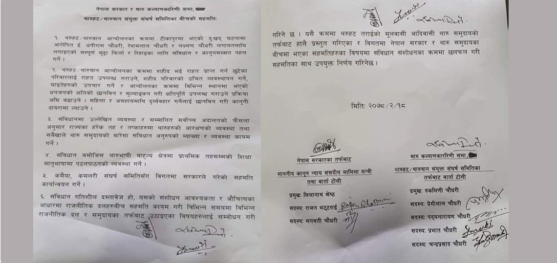 काठमाडौँ । सरकार र थारु कल्याणकारिणी सभाबीच ६ बुँदे सहमति भएको छ । सहमतिमा सरकारका तर्फबाट कानुन न्याय तथा संसदीय मामिला मन्त्री लिलानाथ श्रेष्ठसहित राजन भट्टराई र भगवती चौधरी र थारुवानका तर्फबाट रुक्मिणी चौधरी, प्रेमीलाल चौधरी, पद्मनारायाण चौधरी, प्रभात चौधरी र चन्द्रप्रसाद चौधरीले मंगलबार हस्ताक्षर गरेका हुन् ।