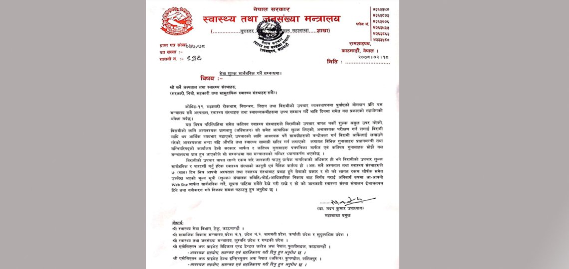 सबै जानकारी स्वास्थ्य संस्था सञ्चालन इजाजतपत्र दिने तथा नवीकरण गर्ने निकाय समक्ष पठाउन स्वास्थ्य तथा जनसंख्या मन्त्रालयले जारी गरिएको विज्ञप्तिमा उल्लेख छ ।
