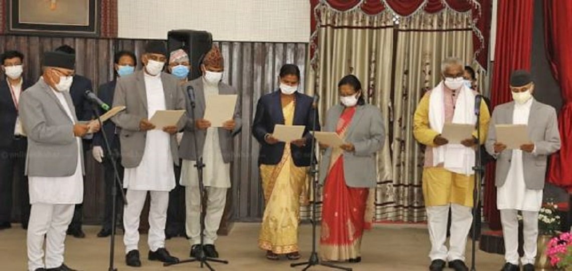 काठमाडौं । नवनियुक्त मन्त्रीहरूले पद तथा गोपनीयताको शपथ लिएका छन् । बिहीबार राष्ट्रपति विद्यादेवी भण्डारीसमक्ष ७ जना मन्त्री र एक जना राज्यमन्त्रीले प्रधानमन्त्री केपी शर्मा ओलीसमक्ष पद तथा गोपनीयताको शपथ लिएका हुन् ।