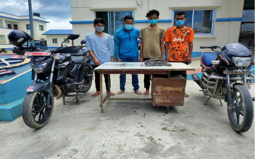 सुनवर्षी नगरपालिका–८ स्थित सडकमा मे.१० प ५६२ नम्बरको मोटरसाइकलमा सवार जिवन र मेघराजले कछुवा ल्याउँदै गरेको अवस्थामा प्रहरीले फेला पारेपछि उक्त कार्यमा सहयोग गर्ने को.२३ प ५९३१ नम्वरको मोटरसाईकलमा सवार निरज र आकाशलाई समेत पक्राउ गरेको हो ।