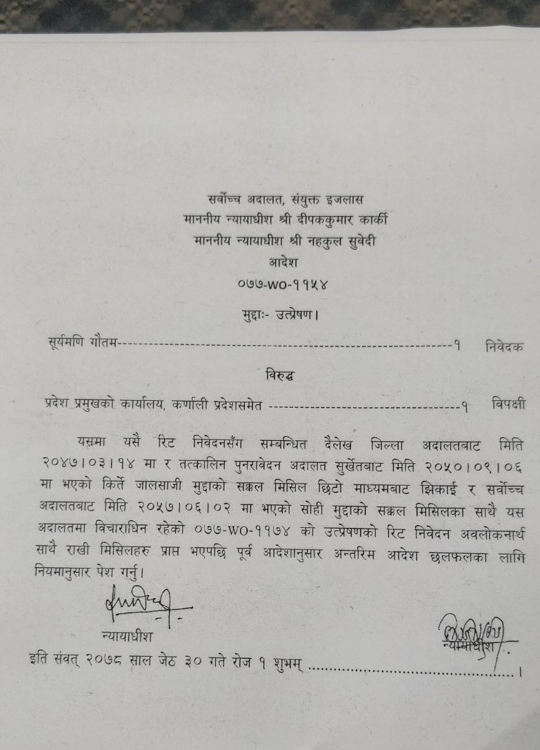 दैलेख जिल्ला अदालतबाट २०४७ असार १४ गते र २०५० पुस ६ गते भएको कीर्ते जालसाजी मुद्दाको सक्कल मिसिल छिटो माध्यमबाट झिकाउन आदेश दिएको सर्वोच्चले जनाएको छ ।