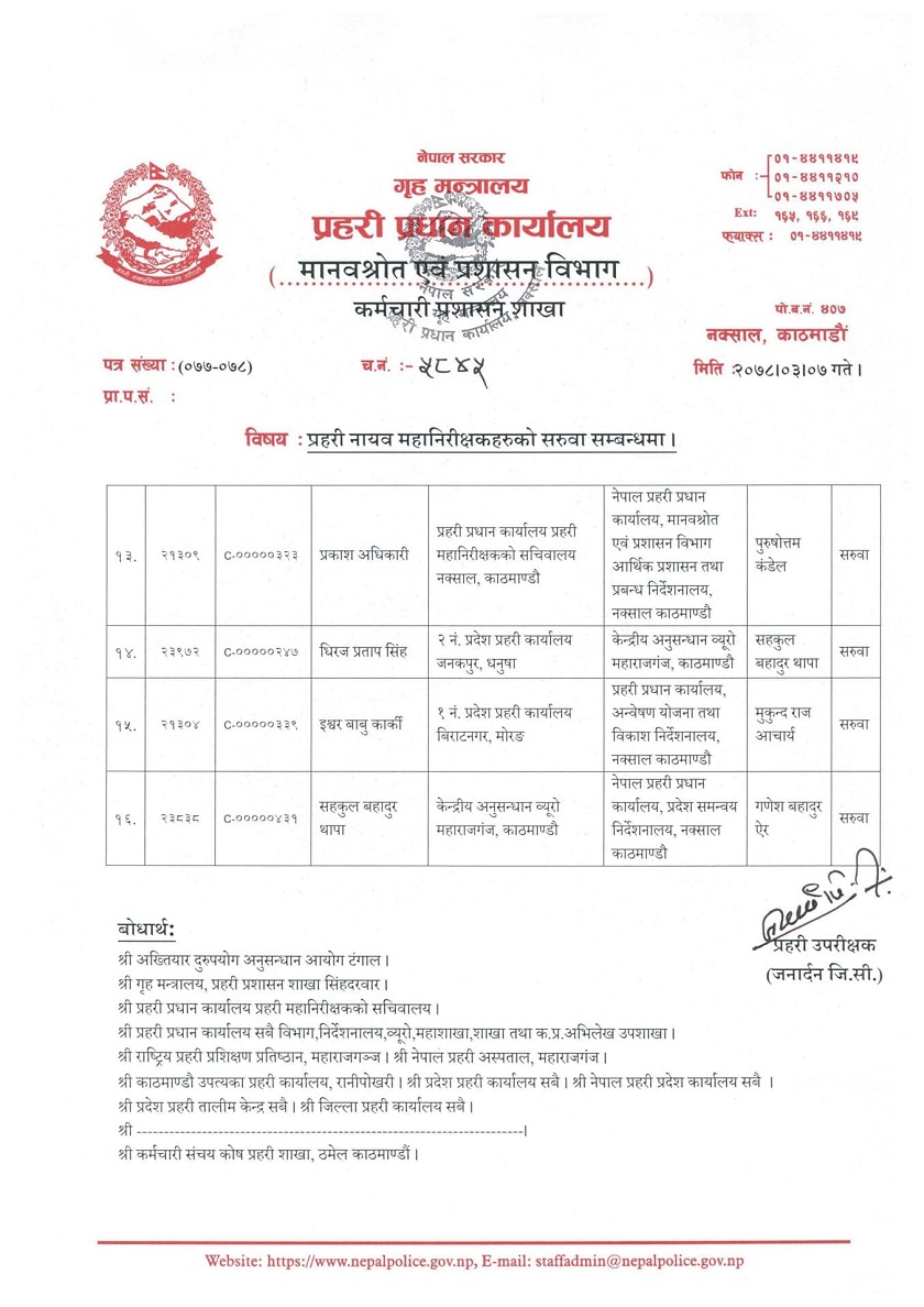 काठमाडौँ । नेपाल प्रहरीका १६ जना डिआईजीको सरुवा गरिएको छ । सोमबार गृहमन्त्री खगराज अधिकारीले डिआईजीको सरुवा गरेका हुन् ।
