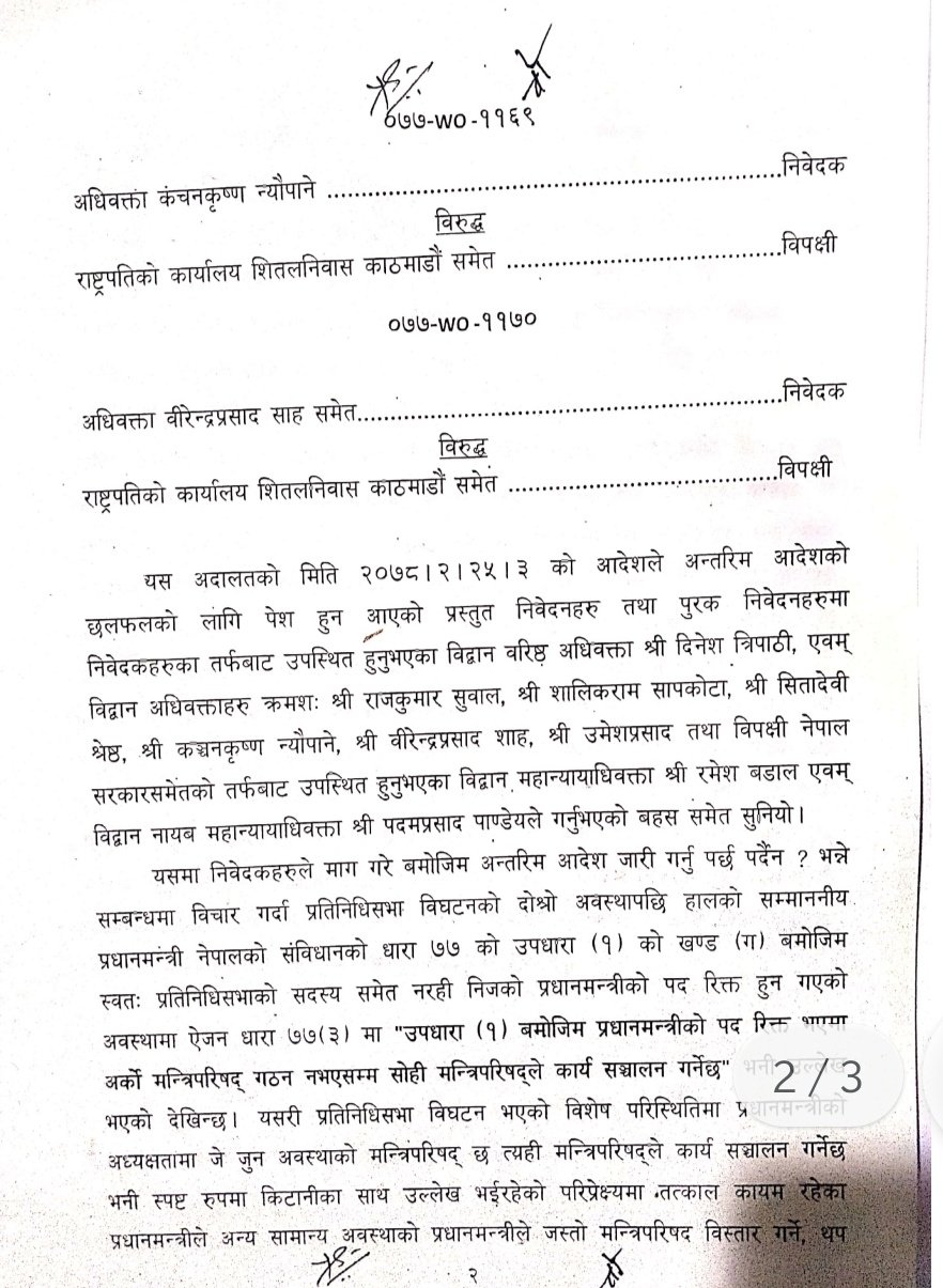 प्रतिनिधि सभा विघटन गरेको कामचलाउ चुनावी सरकारले मन्त्रिपरिषद् विस्तार गर्न नमिल्ने उल्लेख गर्दै वरिष्ठ अधिवक्ता दिनेश त्रिपाठीलेलगायतले सर्वोच्चमा रिट दायर गरेका थिए ।