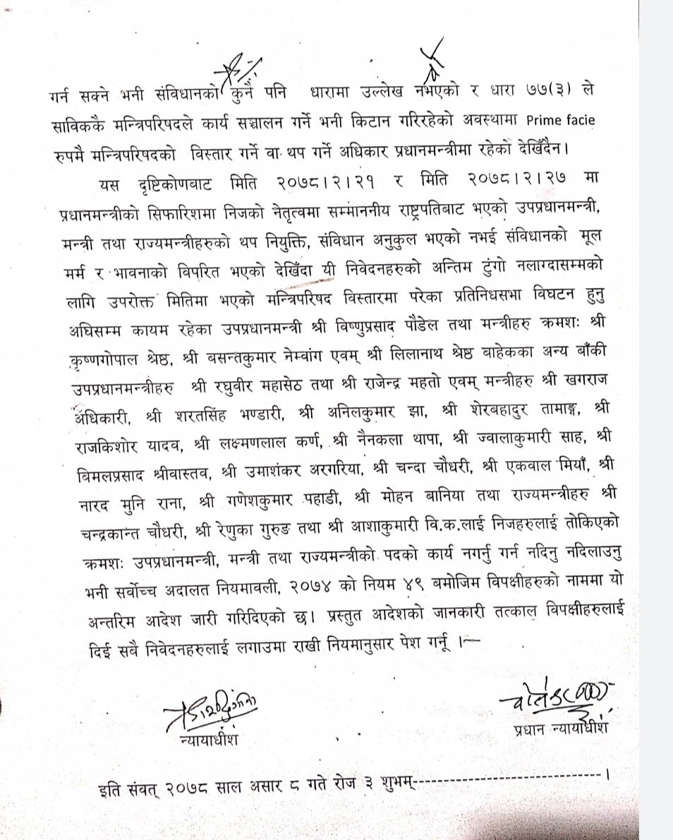 काठमाडौँ । सर्वोच्च अदालतले मन्त्रिपरिषद विस्तारलाई बदर गरेको छ । मंगलबार प्रधानन्यायाधीश चोलेन्द्रशम्शेर जबरा र न्यायाधीश प्रकाशकुमार ढुंगानाको इजलासले मन्त्रिपरिषद विस्तारलाई बदर गरेको हो ।