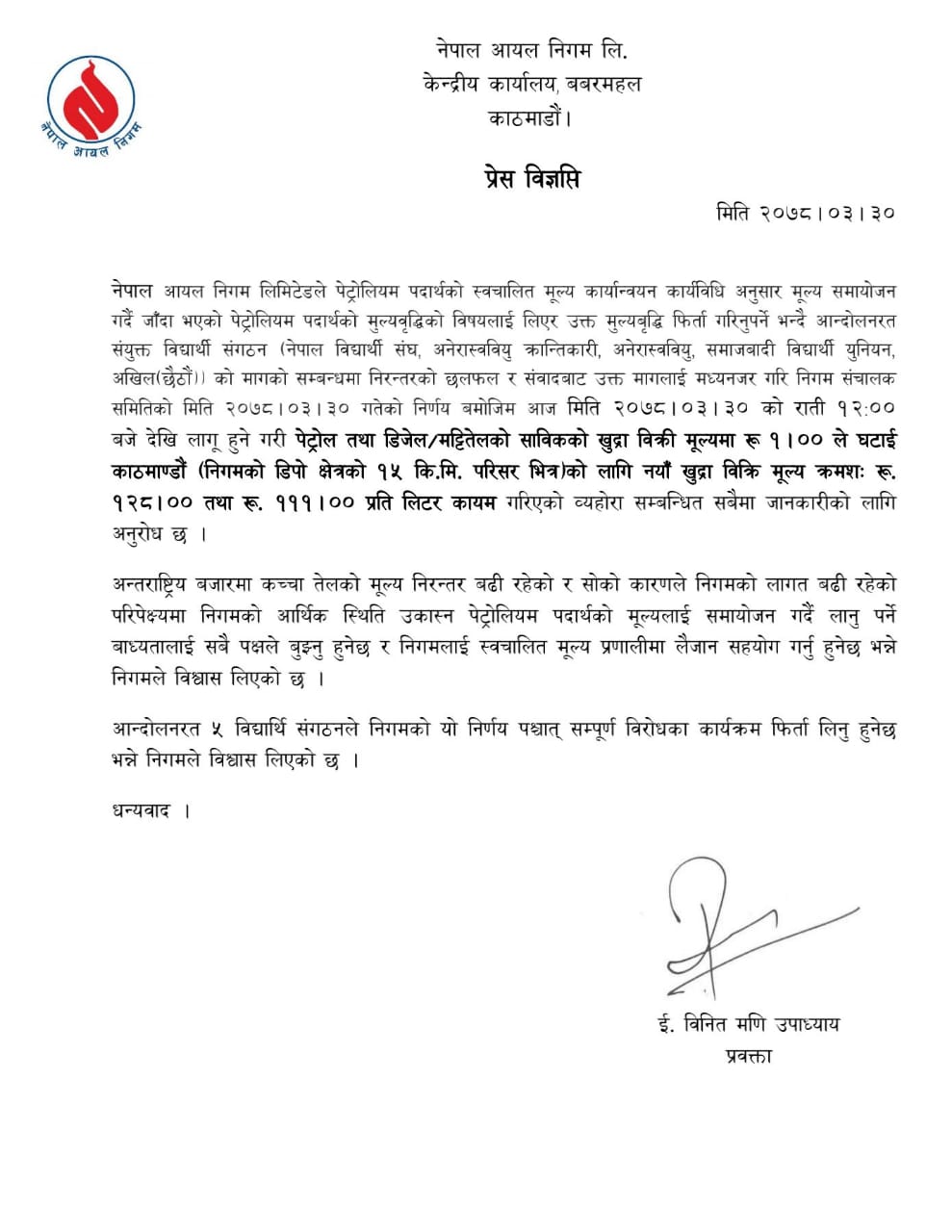 बुधबार राति १२ बजेदेखि लागू हुने गरी पेट्रोल तथा डिजेलको विक्री मूल्यमा प्रतिलिटर १ रुपैयाँ मूल्य घटाइएको निगमले जनाएको छ । योसँगै पेट्रोल प्रतिलिटर १२८ रुपैया कायम गरिएको छ । त्यस्तै, डिजेल र मट्टितेलको मूल्य १११ रुपैयाँ कायम गरिएको छ ।