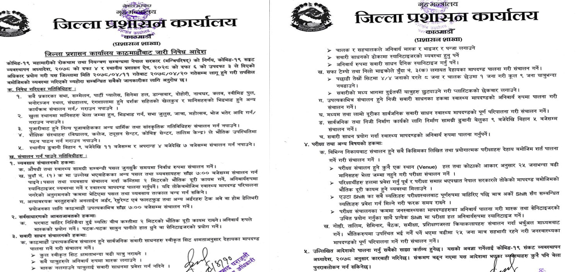 निषेधाज्ञामा कुनै पनि प्रकारका सभा, सम्मेलन, सिनेमा हल, पार्टी प्यालेस, डान्सबार, दोहोरी, नाचघर, क्लबलगायत मानिसहरू भिडभाड हुने कार्यक्रमहरू सञ्चालन गराउन पाइने छैन ।