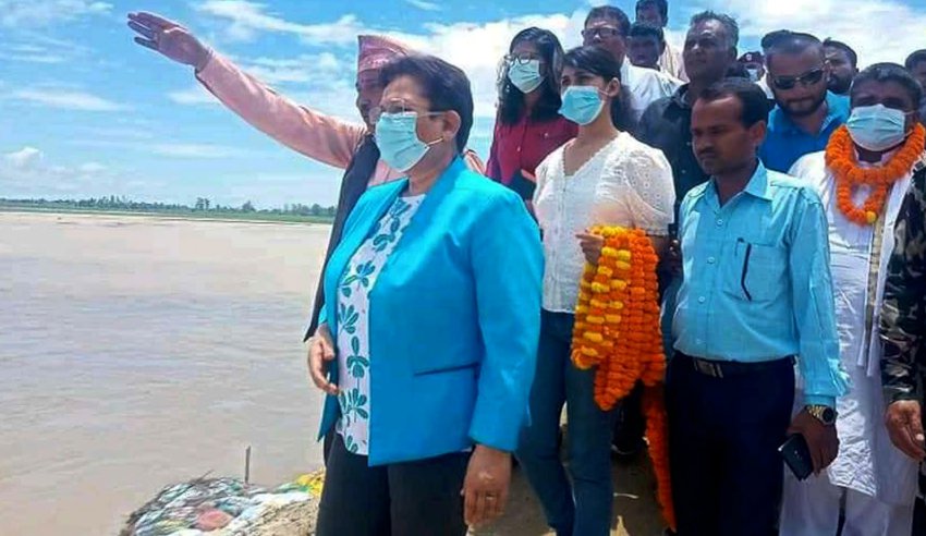 किरतपुर । निरन्तरको वर्षासँगै कमला नदीमा पानीको बहाव बढ्न गई धनुषाको किरतपुर कटान हुन थालेपछि त्यहाँका जनप्रतिनिधिले ऊर्जा, जलस्रोत तथा सिँचाइमन्त्री पम्फा भुसालको ध्यानाकर्षण गराए । त्यसलगतै मन्त्री भुसालले जलस्रोत तथा सिँचाइ विभागका महानिर्देशक मधुकरप्रसाद राजभण्डारीलाई निरीक्षण गर्न पठाए र विभागको आपतकालीन कोषबाट रु ५० लाख निकासा गरी नदीको कटान रोक्न निर्देशन दिए । तत्काल काम शुरु भयो तर निरन्तर कटान नरोकिएको खबर आएसँगै मन्त्री भुसालले बिहीबार स्थलगत निरीक्षण गरेकी छिन् ।