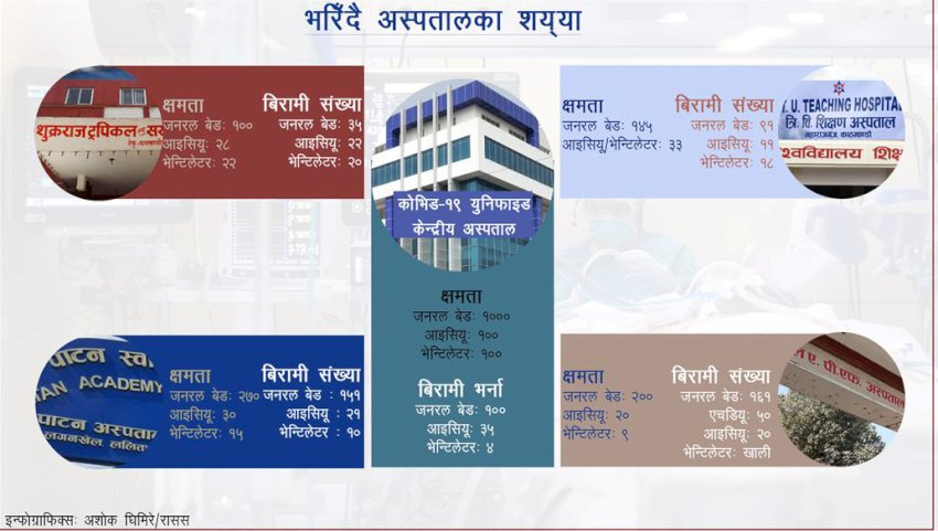 कोभिड–१९ युनिफाइड केन्द्रीय अस्पताल (वीर अस्पताल), शुक्रराज ट्रपिकल तथा सरुवा रोग अस्पताल, सशस्त्र प्रहरी बल अस्पताल, पाटन अस्पताल, शिक्षण अस्पताललगायत संस्थामा बिरामीको सङ्ख्या दिनानुदिन बढ्दै गइरहेको छ ।