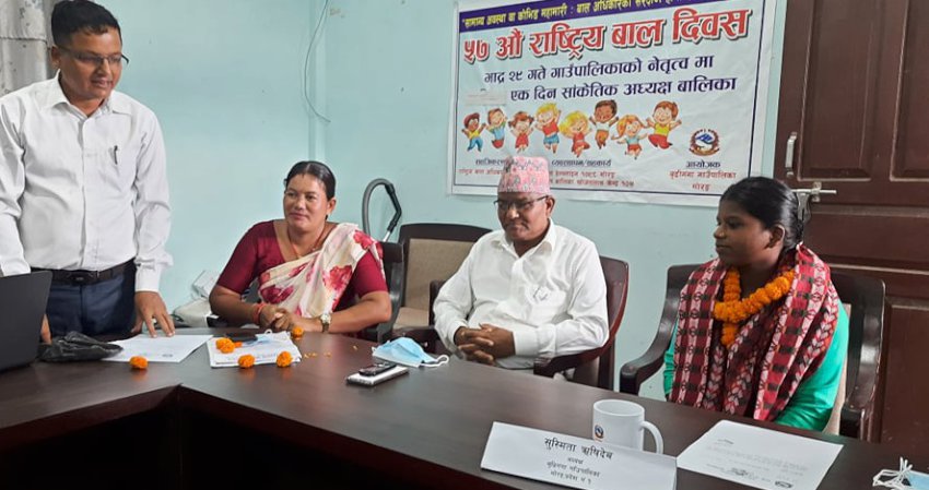 विराटनगर । मोरङको बुढिगङ्गा गाउँपालिकामा १६ वर्षकी सुस्मिता रिशिदेवलाई एक दिने अध्यक्ष बनेकी छन् । ५७औं राष्ट्रिय बाल दिवसको अवसरमा गाउँपालिकाका अध्यक्ष बालचन्द्र माझीले उनलाई एकदिने अध्यक्षको जिम्मेवारी लिखित रुपमै हस्तान्तरण गरेका हुन् ।
