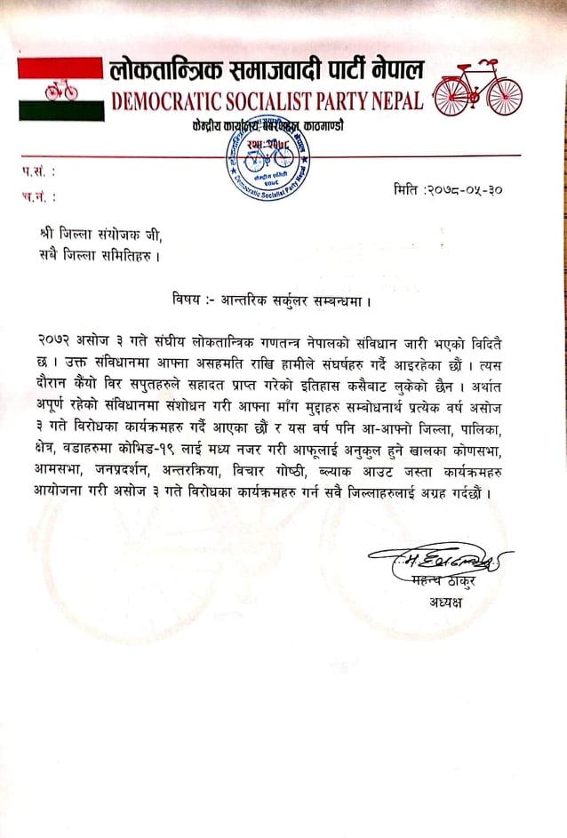 काठमाडौँ । महन्थ ठाकुर नेतृत्वको लोकतान्त्रिक समाजवादी पार्टी नेपाल (लोसपा)ले ३ असोजलाई कालो दिनका रूपमा मनाउने भएको छ । नेपालको संविधान जारी भएको सो दिनमा विरोध कार्यक्रमको आयोजना गर्न लोसपाले सबै जिल्ला कमिटीहरूलाई बुधबार परिपत्र गरेको छ ।