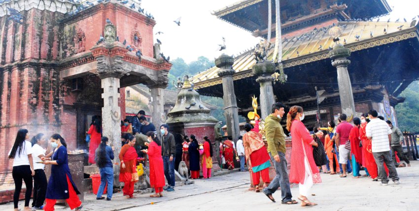 मन्दिरमा पूजा गर्न आएकाहरुले मास्क लगाए पनि भौतिक दुरी कायम गरेको भने देखिएको छैन । मन्दिरहरुमा देखिएको भिडभाडले कोरोना संक्रमण फैलिनसक्ने जोखिम बढाएको छ ।
