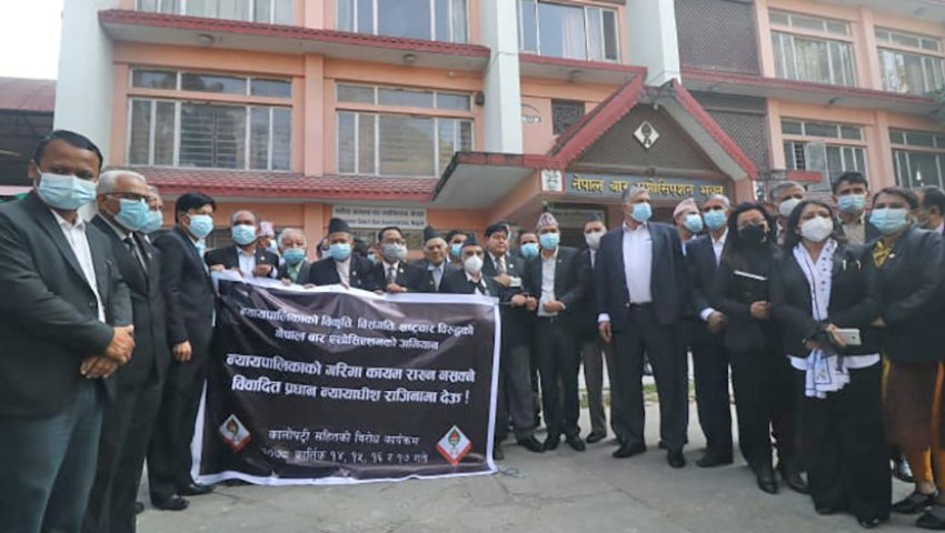 ‘मिति २०७८ कात्तिक १४र१५र१६ गत्तेका दिनसम्म प्रत्येक दिन बिहान १० बजेदेखि ११ बजेसम्म सर्वोच्च अदालतमा कालोपट्टि बाँधी विरोध कार्यक्रम गर्ने र सो कार्यक्रममा सक्रियतापूर्वक सहभागी हुन काठमाडौं उपत्यकामा रहेका बार एकाइका कानून व्यवसायीज्यूहरुलगायत सम्पूर्ण कानून व्यवसायीज्यूहरुलाई अनुरोध गर्ने,’ बारले पदाधिकारी बैठकपछि जारी गरेको विज्ञप्तीमा भनिएको छ ।