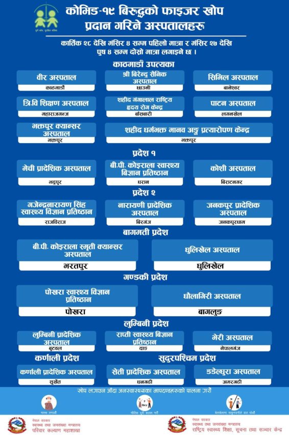काठमाडौँ । स्वास्थ्य तथा जनसङ्ख्या मन्त्रालयले कोरोना भाइरस विरुद्धको खोप ‘फाइजर’ यही कात्तिक २८ देखि मङ्सिर ४ गतेसम्म लगाउने भएको छ ।