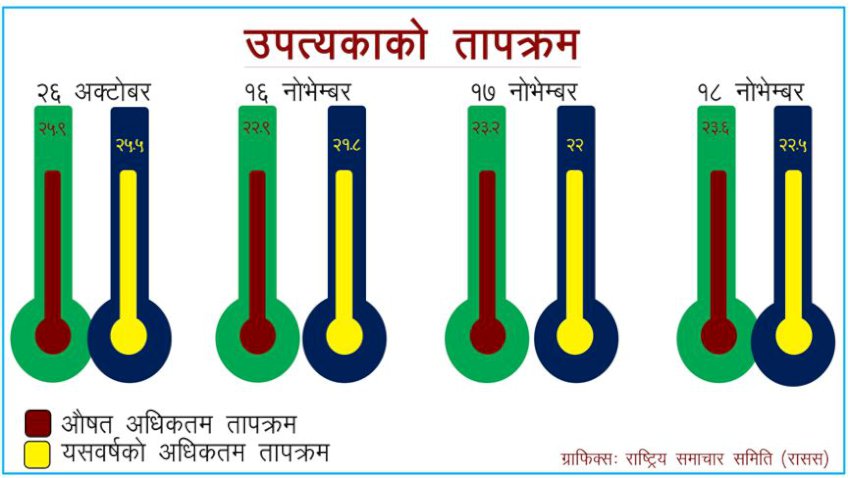 दुई दिन नोभेम्बर १७ (बुधबार) काठमाडौँ उपत्यकाको अधिकतम तापक्रम (३० वर्षको औषत तापक्रम २३.२ डिग्री) हो । यसपालिको अधिकतम तापक्रम घटेर २२ डिग्रीमा झरेको छ । अघिल्लो वर्ष सोही दिन २२ दशमलव ६ डिग्री थियो । त्यसको अघिल्लो दिन नोभेम्बर १६ (मङ्गलबार) औषत अधिकतम तापक्रम २२ दशमलव ९ हो । त्यसदिन तापक्रम २१ दशमलव ८ डिग्रीमा झरेको जल तथा मौसम विज्ञान विभागले जनाएको छ । हिजो बिहीबार औषत तापक्रम २३ दशमलव ६ हो तर तापक्रम घटेर २२ दशमलव ५ मा आएको थियो ।