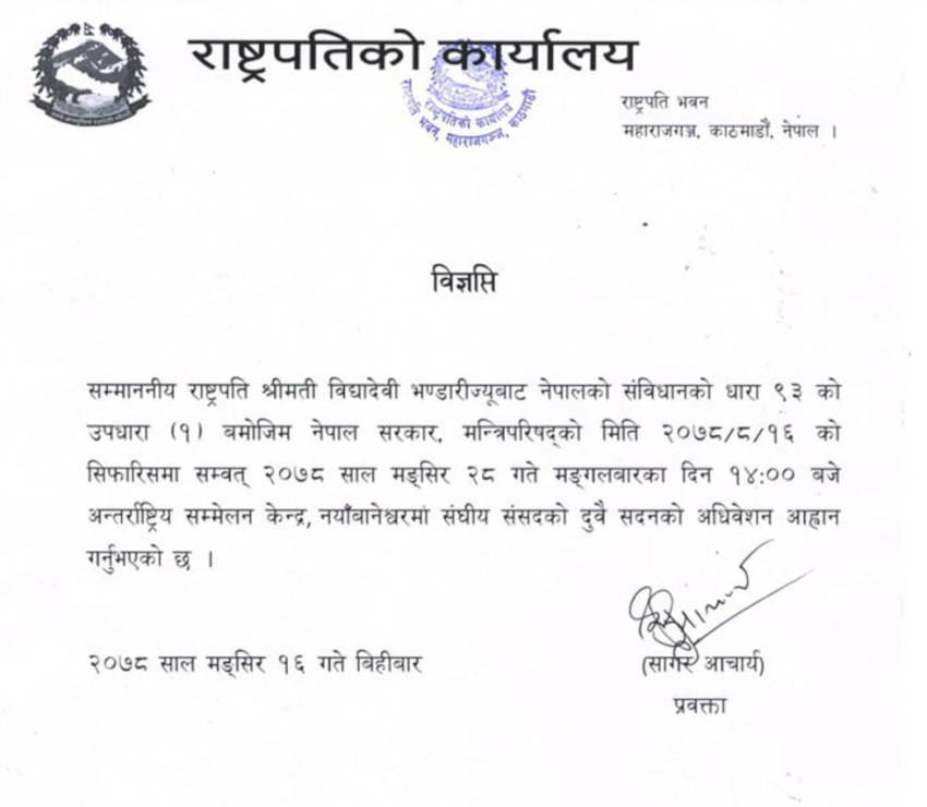 राष्ट्रपति भण्डारीले नेपाल सरकारको यही मङसिर १६ गतेको निर्णय र सिफारिसबमोजिम नेपालको संविधानको धारा ९३ को १ बमोजिम बैठक आह्वान गरेको राष्ट्रपतिको कार्यालयले आज जारी गरेको विज्ञप्तिमा जनाइएको छ ।