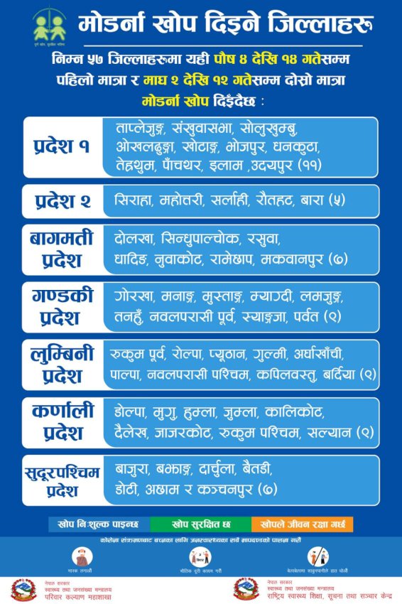 काठमाडौं । सरकारले आज (आइतबार) पौष ४ गते देखि १४ गते सम्म देशका ५७ वटा जिल्लाहरुमा मोडर्ना खोपको पहिलो मात्रा दिने स्वास्थ्य तथा जनासंख्या मन्त्रालयले जनाएको छ । मन्त्रालयका अनुसार सरकारले खोपको दोस्रो डोज भने माघ २ गते देखि १२ गते सम्म प्रदान गर्ने छ ।