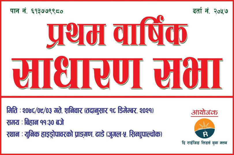 सिन्धुपाल्चोक । सिन्धुपाल्चोक जिल्लालाई कार्यक्षेत्रको रुपमा ससामावेश गरी दर्ता भएको दि राइजिङ लिडर्स युवा क्लबले आफ्नो प्रथम वार्षिक साधारण सभा सम्पन्न गरेको छ । यस क्लबले विगत एक वर्ष देखि स्थानीय तह जुगल/बलेफी गाँउपालिका, सिम्ले–ढाँडे बजार क्षेत्रमा विभिन्न प्रशंसा योग्य कामहरु गर्दै आइरहेको छ । सिम्ले–ढाँडे बजारलाई ध्वनी प्रदुषन बाट जोगाउनको लागि हर्न निषेधित क्षेत्र घोषना, रातीको समयलाई मध्ये नजर गर्दै स्थानीय हाइड्रो सँगको समन्यमा बजारी क्षेत्रका पोलहरुमा बत्ति जडान, फोहोर जम्मा गर्नको लागि डस्टबीनको व्यवस्था, बेला–बेलामा गाँउ तथा स्थानीय नदी सरसफाइ कार्यक्रम जस्ता विभिन्न कामहरु यस क्लबले गर्दै आइरहेको छ ।