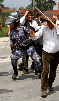 काठमाडौं । नयाँ संविधानमा दलितहरुको अधिकार समेटीनु पर्ने माग गर्दै एक घण्टे धर्ना दिन बिजुली बजार पुल पुगेका दलित अधिकारकर्मीहरुमाथि प्रहरीले निर्मम लाठी प्रहार गरेको छ । प्रहरीको लाठी चार्जमा एक जनाको खुट्टा भाँचिनुका साथै दर्जनौ दलित अधिकारकर्मी घाइते भएको दलित अधिकारकर्मी नेताहरुले बताएका छन् । संयुक्त दलित संघर्ष समितिको आयोजनामा बिजुली बजार पुल पुगेका उनीहरुमाथि प्रहरीले लाठी प्रहार गर्दा दलित नेता रणेन्द्र बराली, दलजित श्रपाली, मनबहादुर विक, गणेश विश्वकर्मा, कमला हिमचुली लगायतका नेताहरु घाइते भएका छन् । प्रहरीको लाठी चार्जबाट दिलीप हरिजन गम्भिर घाइते भएका छन, उनीको टाउकोमा चोट लागेकाले उनको सिभिल हस्पिटलमा उपचार भइरहेको छ । अन्य घाइतेहरुको समेत सिभिल हस्पीटलमा नै उपचार भइरहेको छ । दलित अधिकार सङ्घर्ष समितिले आयोजना गरेको विरोध प्रदर्शनका क्रममा बिजुलीबजारमा झडप भएको हो । जसमा कांग्रेस, एमाले र माओवादीका एक दर्जन सभाषद् पनि घाइते भए । सभासद्हरुमा मानबहादुर विश्वकर्मा, जितु गौतम, दलजित सुनार तथा दलित अधिकार सङ्घर्ष समितिका संयोजक तथा पूर्वसभासद् विनोद पहाडी, अधिकारकर्मी कमला हेम्चुरी, सरु सुनार, गणेश विक, पद्म सुन्दासलगायत झडपमा परी घाइते भएका हुन् । गृहमन्त्रीलाई जवाफ दिन सभामुखको निर्देशन बिजुलीबजारमा  दलित सभाषद तथा अधिकारकर्मी भएको दमनका बारेमा जवाफ दिन सभामुख सूवास नेम्वाङले गृहमन्त्री वामदेब गौतमलाई निर्देशन दिएका छन् । सभासदहरुले धारणा राखिसकेपछि सभामुख सुवास नेम्वाङले बुधबारको बैठकको सुरुवातमै जवाफ दिन गृहमन्त्री बामदेव गौतमलाई निर्देशन दिए । उनले भने, ‘सिंगो व्यवस्थापिका संसदले चिन्ता र सरोकार व्यक्त गरेको छ । त्यसैले माननीय गृहमन्त्रीको गम्भीर ध्यानाकर्षण गराउँदै भोलीको बैठकको सुरुवातमै कुरा राख्नका लागि र सभासदहरुले उठाउनु भएको सम्पूर्ण पक्षको जानकारी दिनका लागि निर्देश गर्दछु ।’ संविधानसभाको बैठकमा दलित अधिकारकर्मी तथा सभाषदमाथी गरिएको दमनका विरुद्धमा दलित सभाषदहरुले विषेश समय लिदैं विरोध गरेपछि नेम्वाङले यस्तो निर्दैशन दिएका हुन् । प्रहरीले गरेको निर्मम दमन फोटोफिचर हेर्नुहोस् \"dalit-aandolan\"                     \"Daljit-Shripaili\"                       \"lathi03\"                     \"lathi01\"                   \"dalit_daman                                                 \"dalit_daman                                                 \"dalit_daman