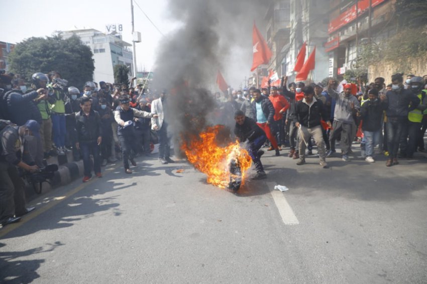 यस्तै,नेकपा एसनिकट युवा संघले 'एमसीसी चाहिँदैन, देश बेच्न पाइँदैन' भन्दै नाराबाजी गरेर टायर बालेर प्रदर्शन गरेका छन् ।