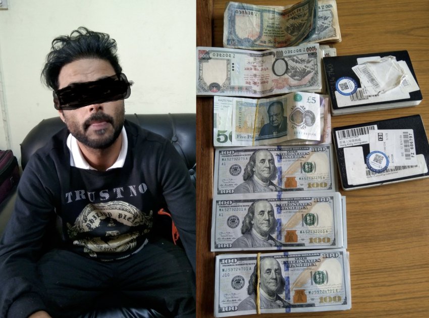 प्रहरीले उनको झोलाबाट अमेरिकी डलर २० हजार १५०, नेपाली रुपैयाँ ३१ हजार ६००, इंगल्याण्ड पाउण्ड ५, जर्जिया लरी ५०, भारतीय रुपैयाँ १००, यूइई दिराम १ हजार ३५५लगायतका मुद्रा बरामद गरेको छ ।