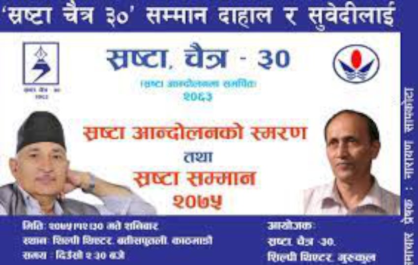 आन्दोलनमा साहित्य क्षेत्रको योगदानलाई स्मरण गर्न १७ जना युवा साहित्यकारको पहलमा विसं २०६३ मा स्थापित ‘स्रष्टा चैत्र ३०’ संस्थाले आयोजना गरेको कार्यक्रममा यसवर्षको सम्मान साहित्यकारहरू वासुदेव अधिकारी र विवश पोखरेललाई तथा वर्ष २०७७ को सम्मान शार्दूल भट्टराईलाई प्रदान गरिएको हो । गत वर्ष घोषितमध्ये अर्का सम्मानित कृष्ण धरावासी मुलुक बाहिर भएकाले उनलाई पछि सम्मान गरिने जनाइएको छ ।