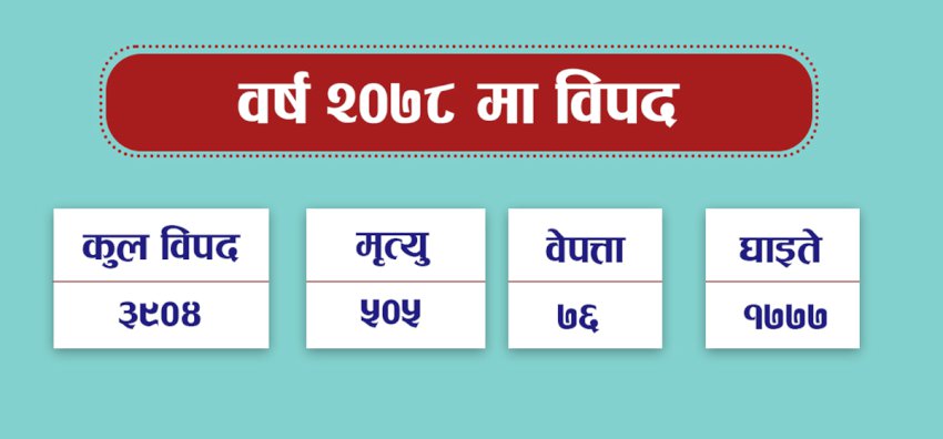वर्ष २०७८ प्राकृतिक विपद्का हिसाबले अत्यन्त खराब स्थितिमा गुज्रियो । बाढी पहिराबाट मुलुकले नसोचेको मानवीय क्षति बेहोर्न पुग्यो । राष्ट्रिय विपद् जोखिम न्यूनीकरण तथा व्यवस्थापन प्राधिकरणका अनुसार वर्ष २०७८ मा देशभरमा विभिन्न प्रकृतिका तीन हजार ९०४ वटा विपत्ति आइलागे । ती विपद्मा परेर कूल ५०५ जनाले अकालमा ज्यान गुमाएका छन् । अझै ७६ जना हराइरहेका छन् भने एक हजार ७७७ जना घाइते भएका छन् ।