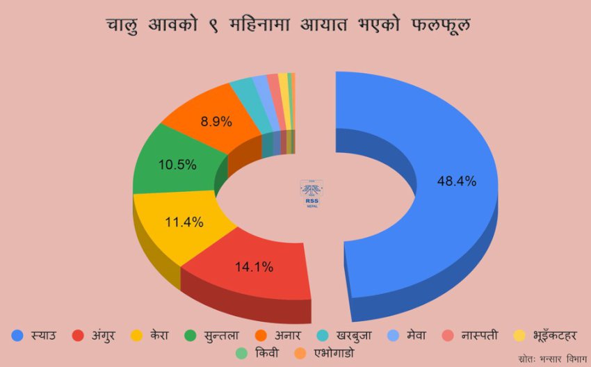 विभागका अनुसार नौ महिनाको अवधिमा प्रमुख फलफूल मात्रै रु ११ अर्ब ७० करोड ८९ लाख २६ हजार बराबरको आयात भएको देखिन्छ । मुलुकको आर्थिक क्षेत्रमा कृषिको योगदान उल्लेख्य रहे पनि अझै कूल कृषियोग्य जमिनमध्ये धेरै बाँझो छ । यस्ता कृषियोग्य भूभागको थोरै मात्रको सही र ब्यवस्थित उपयोग गर्नसके कृषिजन्य उपभोग्य वस्तुमा आत्मनिर्भर हुने अवस्था ल्याउन सकिन्छ । यस्ता उपभोग्य वस्तु आयात गरी अर्बांै रकम विदेशिनबाट जोगिन सक्ने देखिन्छ ।