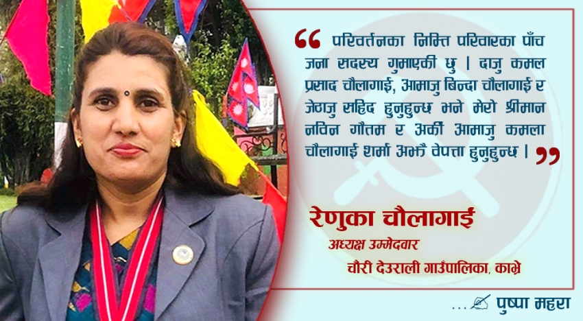 माओवादी जनयुद्ध सुरु भएदेखि नै संगठनमा आवद्ध रेणुका चौलागाई चौेरी देउराली गाउँपालिकाको अध्यक्षमा उम्मेदवार छिन्।