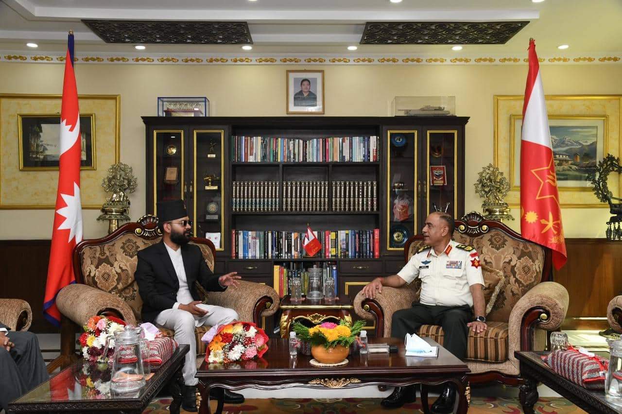 काठमाडौं । काठमाडौं महानगरपालिकाका नवनिर्वाचित मेयर बालेन शाहले नेपाली सेनाका प्रधानसेनापति प्रभुराम शर्मासँग भेट गरेका छन्।