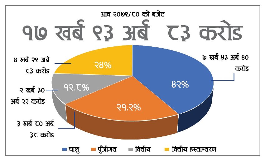 अर्थमन्त्री जनार्दन शर्मा प्रभाकरले आव ०७९–८० को बजेट सार्वजनिक गर्दा राष्ट्रिय योजना आयोगले दिएको सिलिङको परिधि भित्रै रहेर १७ खर्ब ९३ अर्ब रुपैयाँको बजेट सार्वजनिक गरेका छन् । आयातबाट उत्पादनतर्फ, जोखिमबाट समष्टिगत आर्थिक स्थिरतातर्फ र बञ्चितीकरणबाट समावेशीतातर्फ प्रस्थान हुने गरी बजेट ल्याएका छन् ।