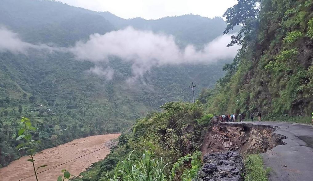 तनहुँ । तनहुँको आँबुखैरेनी गाउँपालिका–४ डम्पीमा सडक भासिएको स्थानबाट एउटा कार तल खसेको देखिएको छ ।