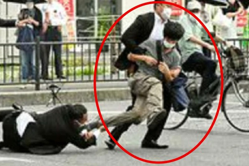 प्रत्यक्षदर्शीहरूले एक जना व्यक्तिले ठूलो बन्दुक बोकेर आबेभन्दा केही मिटर पर हिँडेको र दुई पटक गोली चलाएको देखेको बताएका छन्।