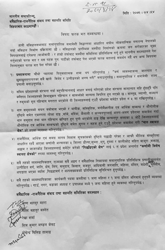 \"Mahara-Farak-Mat\"कामठाडौं । प्रदेशको सिमांकन, उत्पीडित समुदायको प्रतिनिधित्व लगायतका विषयलाई समेटेर संवैधानिक राजनीतिक सम्बाद तथा सहमति समितिमा एमाओवादीका पाँच सभासदले छ बुँदे फरक मत सहितको पत्र बुझाएका छन् ।   शनिबार राती प्रमुख चार राजनीतिक दलहरुले गरेको सहमतिमा उनीहरुले फरक मत सहितको पत्र आइतबार समितिमा बुझाएका हुन् । फरक मत राख्नेहरुमा एमाओवादीका महासचिव कृष्णबहादुर महरा, शक्ति बस्नेत, रेखा शर्मा, शिवकुमार मण्डल र योगेन्द्र घिसिङ छन् ।   उनीहरुले बुहपहिचानलाई आधार मानेर गरिएको प्रदेशहरुको संरचना सामान्तया सहि हुँदा हुँदै पनि कतिपय जिल्लाहरुको सिमांकन पहिचान र मान्यता विपरित हुन गएको बताएका छन् ।   बाग्लुङ, म्याग्दी, सल्यान र रुकुमको मुल पहिचान मगरात भएको उल्लेख गर्दै एमाओवादीका पाँच सभासदले यी जिल्लालाई एउटैमा समेटेर ५ नम्बर प्रदेशमा राख्नु पर्ने बताएका छन् ।   यस्तै दाङ, बाँके, बर्दिया, कैलाली र कञ्चनपुरलाई अलग प्रदेशमा राख्दा थारु पहिचान खण्डित हुने बताउँदै उनीहरुलले दाङदेखि कञ्चनपुरसम्मका पाँच जिल्लालाई एउटै प्रदेशमा राख्न र थारु स्वायत्त क्षेत्र व्यवस्था गर्न भनेका छन् । \"krishna-bahadur-mahara\" डोल्पा, मुगु, हुम्ला र कालिकोटसहित बाजुरा, बझाङ, अछाम र जाजरकोटलाई समेटेर कर्णाली विशेष स्वायत्त क्षेत्र बनाउन माग गरेका छन् ।   एमाओवादी सभासदहरुको फरक मतमा सबै तहको व्यवस्थापपिकाका कार्यकारी पदमा कम्तिमा एक महिला र एक दलित अनिवार्य हुने व्यवस्था गर्न पनि माग गरेका छन् ।
