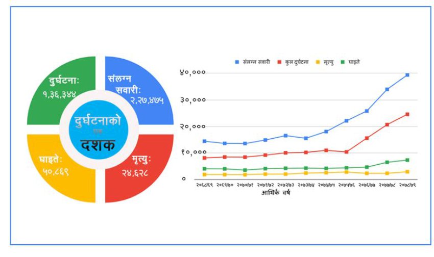 दश वर्षअघि (आव २०६८/६९) को तथ्याङ्कमा कुल आठ हजार ९२ दुर्घटना भएका थिए । त्यसमा १४ हजार दुई सय ८७ सवारी साधन परेका थिए । दुर्घटनामा एक हजार आठ सय ३७ को मृत्यु र चार हजार १९ जना गम्भिर घाइते भएका थिए । ठिक त्यसको १० वर्षपछि आर्थिक वर्ष २०७८र७९ को अभिलेखानुसार सवारी दुर्घटना ह्वात्तै बढेर २४ हजार पाँच सय ३८ पुग्यो । उक्त साल ३९ हजार तीन सय ७९ सवारी साधन दुर्घटनामा परे । ती दुर्घटनाबाट कुल दुई हजार आठ सय ८३ जनाको मृत्यु भयो भने सात हजार दुई सय ८२ यात्रु गम्भिर घाइते भएका छन् ।