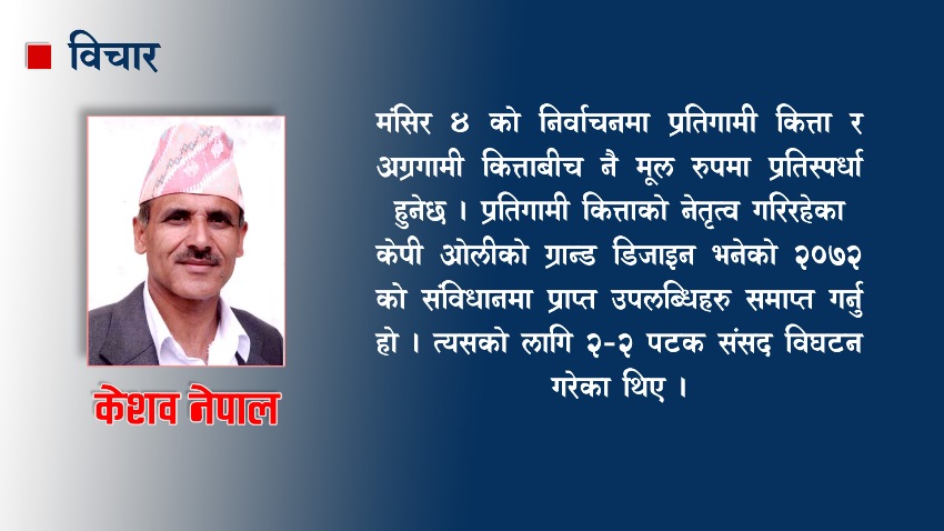 मंसिर ४ को निर्वाचनमा प्रतिगामी कित्ता र अग्रगामी कित्ताबीच नै मूल रुपमा प्रतिस्पर्धा हुनेछ । प्रतिगामी कित्ताको नेतृत्व गरिरहेका केपी ओलीको ग्रान्ड डिजाइन भनेको २०७२ को संविधानमा प्राप्त उपलब्धिहरु समाप्त गर्नु हो । त्यसको लागि २–२ पटक संसद विघटन गरेका थिए । ओलीले त्यो दुस्साहस आफ्नै तागतले मात्रै गरेका थिएनन् । विदेशी शक्तिको आड भरोसा र डिजाइनमा प्रतिगामी कदम चालेका थिए ।