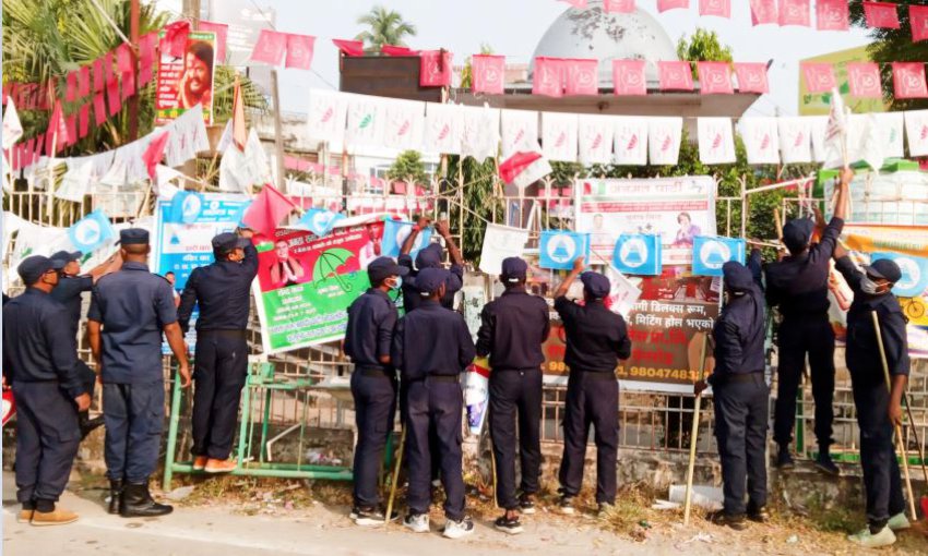 राजविराजस्थित गजेन्द्र चोकसहित नगरको विभिन्न क्षेत्रमा टाँगिएका ब्यानरले नगर नै कुरूप बनेको भन्दै सो सामग्री हटाइएका छन् । प्रहरीले निर्वाचन आचारसंहिता विपरीत नगरका विभिन्न ठाउँमा राजनीतिक दलले टाँगेका विभिन्न पार्टीका झण्डा, पोस्टर र ब्यानर हटाउन थालेको प्रहरी नायब उपरीक्षक नरेश सिँहले जानकारी दिए ।