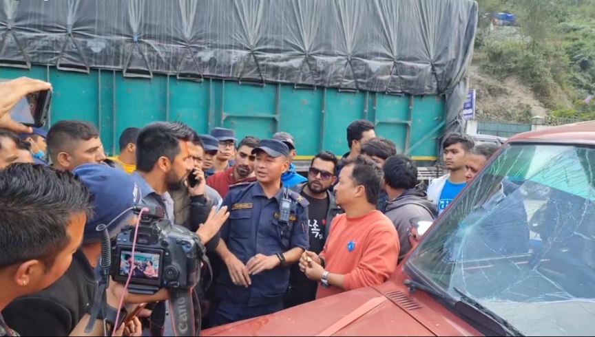 एक जना युवा गाडीमाथि चढेर लात्तिले हानेर सिसा फुटाएको भिडिओ राष्ट्रिय स्वतन्त्र पार्टीका नेता दीपक बोहराले सार्वजनिक गरेका छन्।