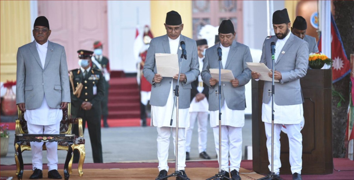 एमालेबाट विष्णु पौडेल, माओवादी केन्द्रबाट नारायणकाजी श्रेष्ठ र राष्ट्रिय स्वतन्त्र पार्टीका सभापति रवि लामिछाने उपप्रधामन्त्री बनेका छन् । एमाले उपाध्यक्षसमेत रहेका पौडेललाई अर्थमन्त्रालय र माओवादी केन्द्रका वरिष्ठ उपाध्यक्ष रहेका श्रेष्ठलाई भौतिक पूर्वाधार र लामिछानेलाई गृहमन्त्रालयको जिम्मेवारी दिइएको छ ।