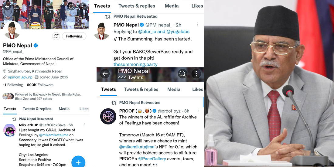 काठमाडौँ। प्रधानमन्त्री कार्यालयको आधिकारिक ट्विटर अकाउन्ट ह्याकरको नियन्त्रणमा रहेको आशंका गरिएको छ ।